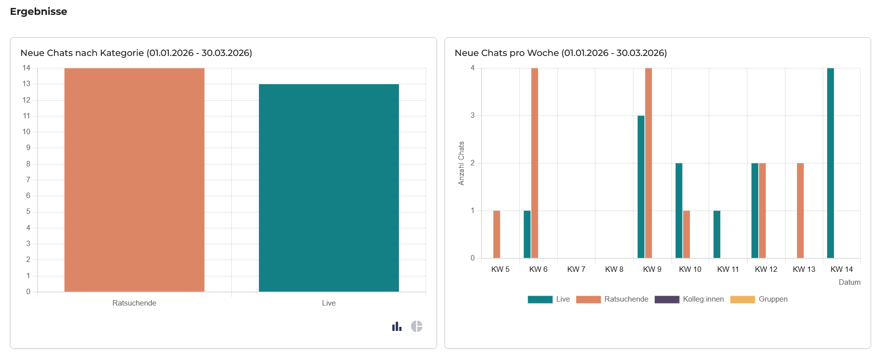 Auf der linken Seite wird angezeigt, wie viel neue Chats im Ratsuchendenchat und anonymen Sofortchat im angegebenen Zeitraum entstanden sind. Auf der rechten Seite werden auch Kolleg:innen- und Gruppenchats angezeigt.